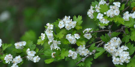 Spring white flowers of hawthorn on a green background. Selective focus.