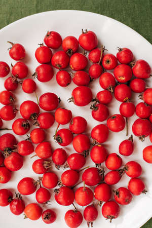 Red berries of fresh hawthorn in a plate standing on a green tablecloth.