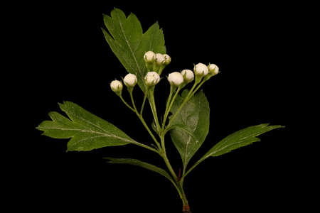 Flowering hawthorn branch (Crataégus monógyna) isolated on a black background close up