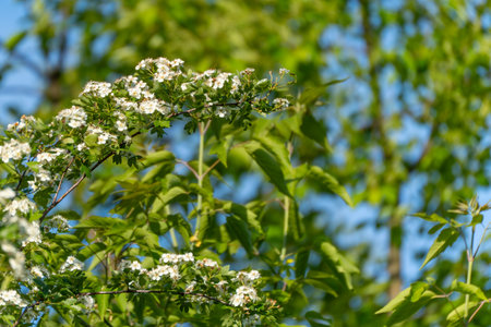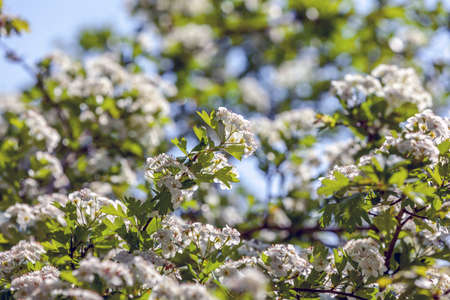 Flowering common hawthorn Crataegus monogyna branches with white blossoms against fresh green foliage and blue sky. Calm spring scene with soft background bokeh.