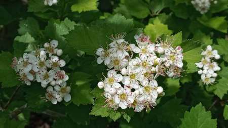 white Crataegus flowers (hawthorn, quickthorn, thornapple, May-tree, whitethorn, Mayflower, hawberry)