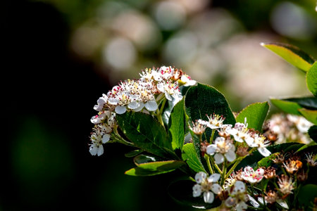 Closeup of the flowers of a common hawthorn (Crataegus monogyna), springtime in Vienna (Austria)
