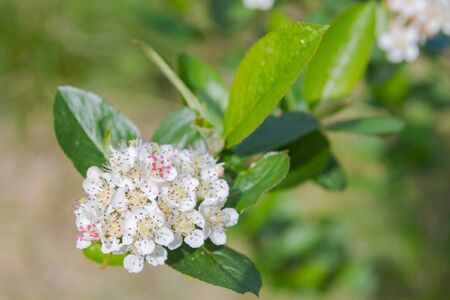Close up of little white flowers at the tip of a bush branch. Blooming bush with green leaves and white flowers with shallow depth of field and selective focus