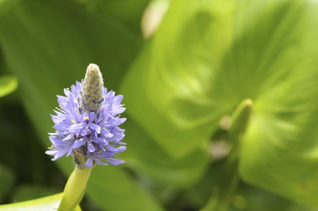 Water hyacinth flower with blurry green leaf in the background