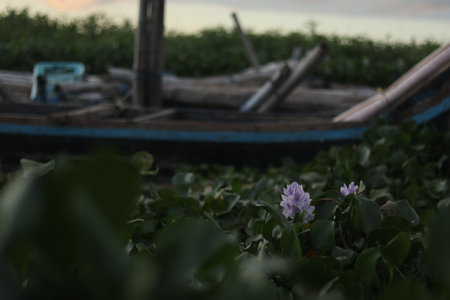 Flowering water hyacinth plants or Eichhornia crassipes that thrive in swamps with a blurred background