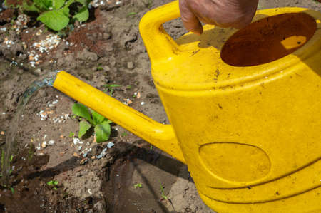 Watering flowers in the garden with a yellow watering can. Close up on water pouring from watering, garden work pour water. Pouring from watering can on plants water, jets of water from watering can.