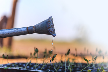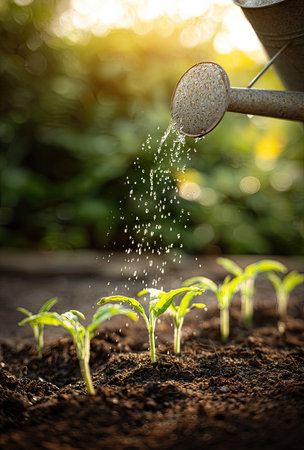 A watering can pours water onto young, green plants emerging from dark soil. The close-up composition highlights the droplets and textures. Sunlight creates a warm glow, suggesting an outdoor garden setting. This image may be used for editorial content or commercial applications, representing growth and care.