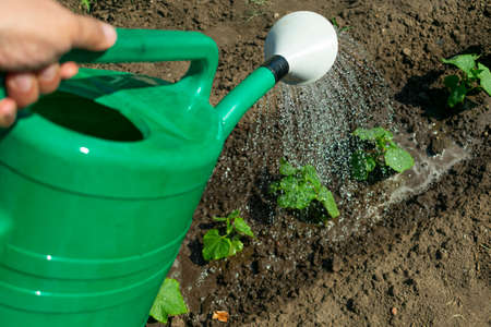 Guy waters green water leach with green plants. care behind a harvest. garden business. Watering flowers and beds. rural areas. solar lighting