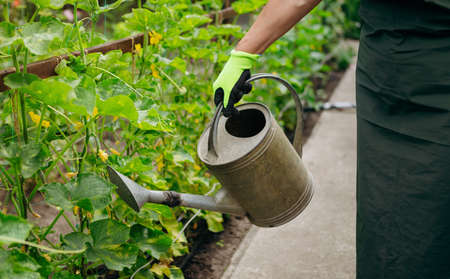 Gardening and farming concept - watering can at farm greenhouse. Watering Tomatoes with a watering can in the garden. Toned.