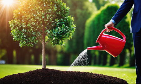 A close-up of a watering can pouring water onto the base of a freshly planted tree, with water droplets sparkling in the sunlight, symbolizing growth and care.