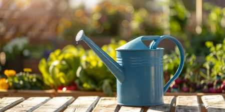 In the gentle glow of the late afternoon sun, a blue watering can provides life-giving water to a thriving vegetable garden.