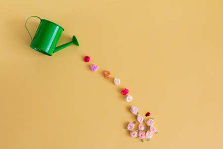 fabric textile silk flowers with green watering can on yellow background for handicraft