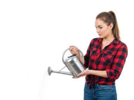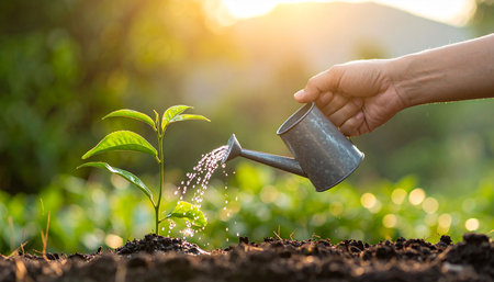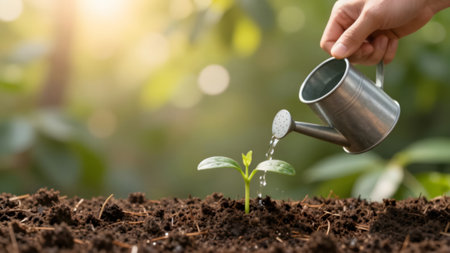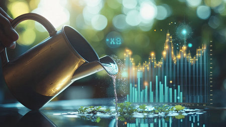 A hand pours water from a vintage watering can onto a small plant. In the background, a digital growth chart illustrates progress and potential, blending nature with technology.