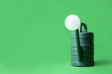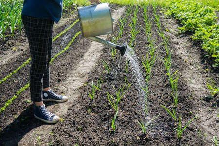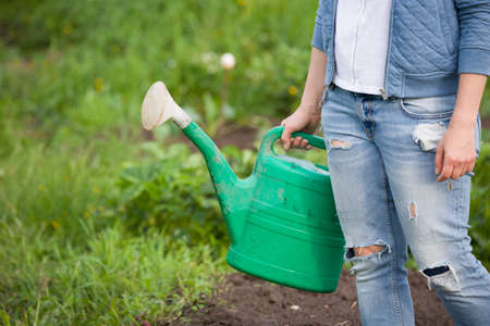 Woman watering plants in garden. Girl with green watering can. Gardening and agriculture concept.