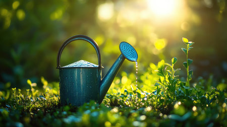 Water droplets cascade from a classic green watering can, sprinkling vibrant foliage and bright flowers. the lush garden setting emphasizes growth, nurturing, and the harmonious beauty of nature's cycle. Generative AI