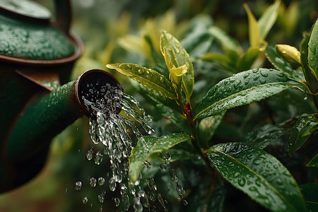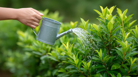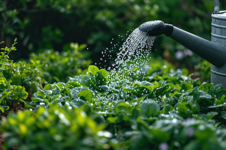 A close-up view of a watering can pouring water onto vibrant green leaves, fresh droplets and lush foliage. ideal for themes related to gardening, hydration, and nature's vitality. Generative AI