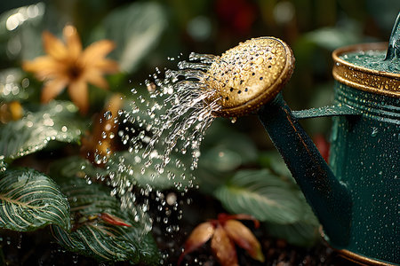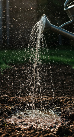 Brilliant sunlight illuminates fresh water cascading from a watering can's spout, soaking into nutrient-rich soil with numerous glistening droplets against a soft green background.