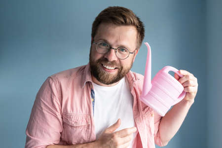 Bearded man in round glasses holds a pink baby watering can in hands and smiles while standing against a blue background.