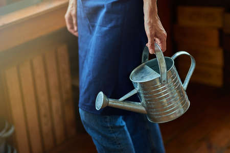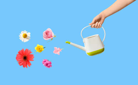 Unrecognisable woman watering flower bed using watering can. Gardening hobby concept. Landscaping concept banner.