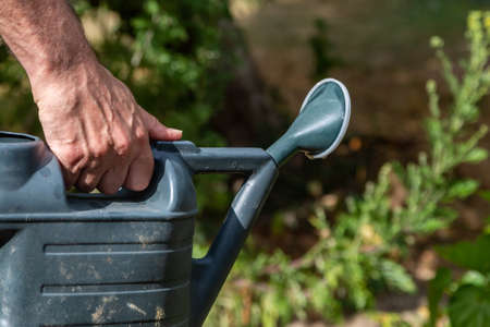 Close-up of a blue iron garden watering can in the background of a home vegetable garden. Copyspace, place for text. High quality photo