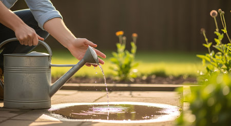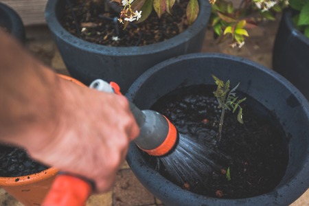 Close-up view of a person watering a small green plant in rich brown soil, capturing the essence of nurturing and growth in a vibrant outdoor garden environment.