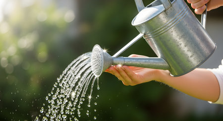 A close-up captures hands tilting a galvanized metal watering can, sending a shower of water droplets that sparkle in the bright sunlight. The lush, blurred green background indicates a garden setting, emphasizing themes of growth, care, and summer gardening.