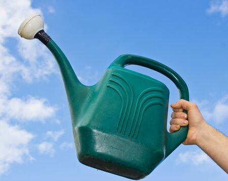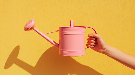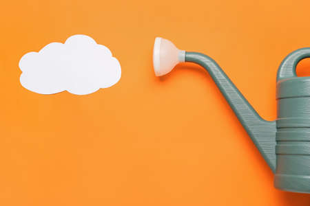 Hand holding a small green watering can and blue water drops on yellow background, art collage, cut out style.