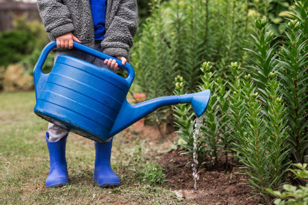 A cute boy with a blue watering can is watering plants and flowers in a summer garden outdoors. The concept of gardening and teaching a child to work.
