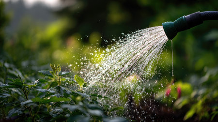 A rubber watering hose spraying water on a lush green garden, creating droplets in the sunlight and adding a refreshing atmosphere