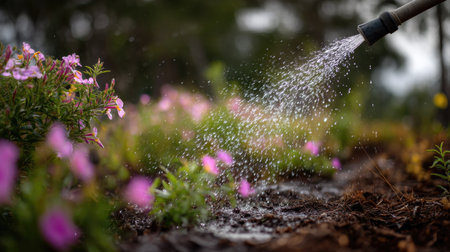 A rubber hose spraying water across a freshly planted flower garden, with droplets falling onto the delicate petals