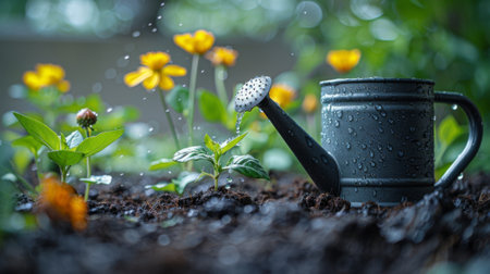 Close-up of a watering can showering water on vibrant garden plants, showcasing lush greenery and blooming flowers. the image evokes a sense of tranquility and growth, ideal for horticultural themes or gardening promotions. Generative AI