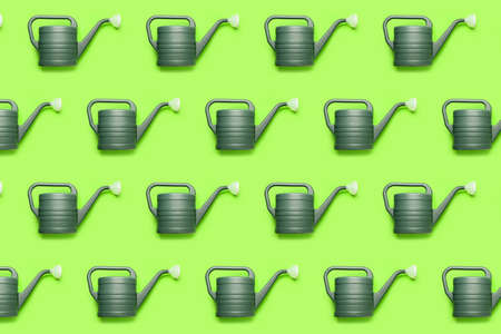 Metal watering can with water drops standing on earth on flowerbed or gardenbed. Gardening and planting concept.