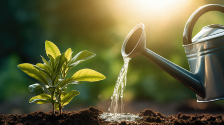 Green plant sprouting from soil with watering can, sustainable growth concept.