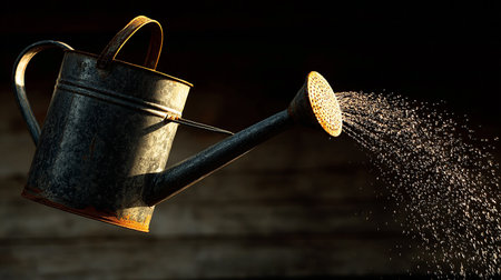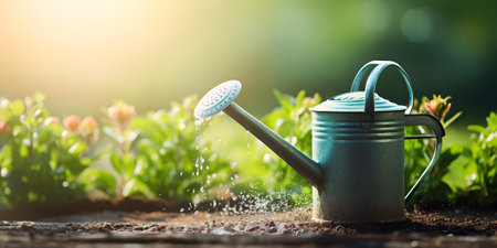 An old metallic watering can is captured as it pours water onto small, green plants. The composition uses selective focus, highlighting the water droplets. The scene suggests a gardening environment, possibly outdoors during daylight. This image could be used for illustrations related to gardening, nature, and plant care.