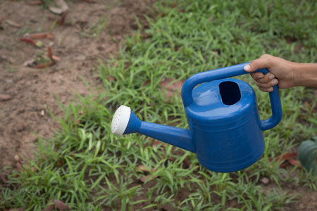 Beautiful asian thai woman short dark hair wartering plant in garden.