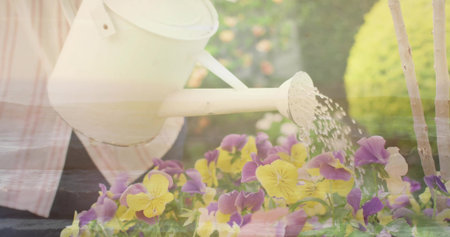 Gardener wearing striped shirt watering purple-yellow pansies in garden with white can and droplets. Botanical, horticulture, outdoor, tranquility, vibrant, nurturing, growth