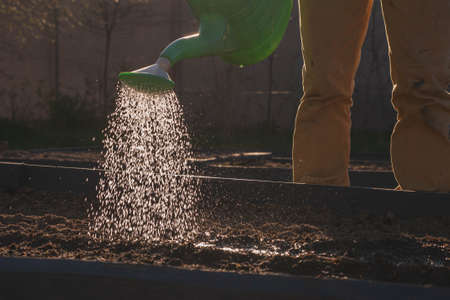Man farmer watering young seedling on garden bed. Drops of water in backlight. Agriculture and farming concept. Growing organic vegetables on farm.