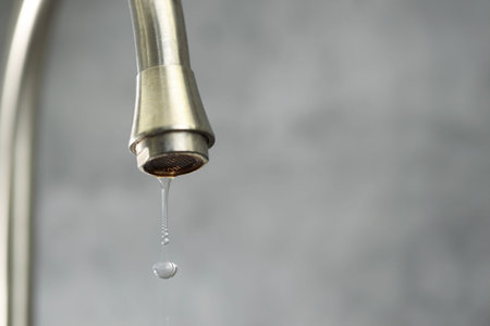 Water saving concept. Water dripping from tap on gray background, closeup. Space for text
