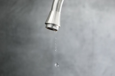 Save water concept. Water dripping from tap against gray background, closeup