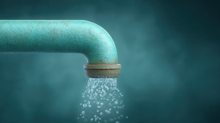 Water droplets steadily leaking from a cracked pipe close to an airport bathroom tap