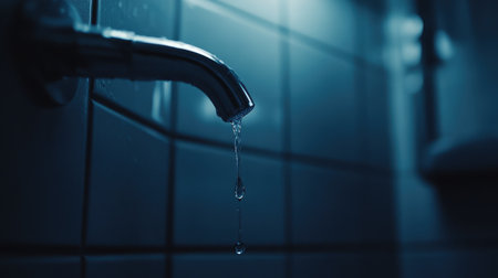 A close-up of a leaking faucet with water droplets forming on the spout, highlighting issues of household water conservation.