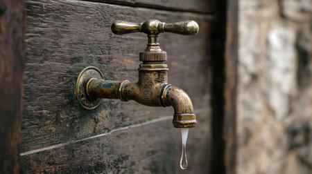 A stunning image of an antique brass water tap mounted on a weathered wooden background. The tap showcases rustic charm with dripping water, emphasizing vintage design elements.