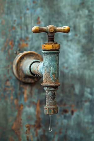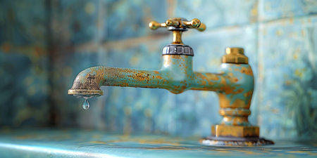 Close-up of rusty metal water tap with dripping water.