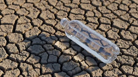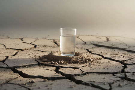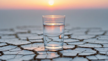a glass of water stands on cracked, dry soil, symbolizing the struggle for life in harsh conditions