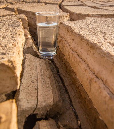 A glass of water on dry cracked surface symbolizes scarcity and hope