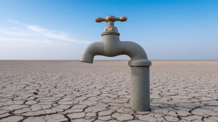 A striking image of a dry landscape featuring a single faucet, symbolizing water scarcity and environmental issues, set against a clear blue sky.