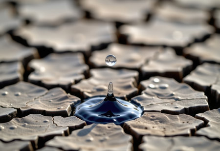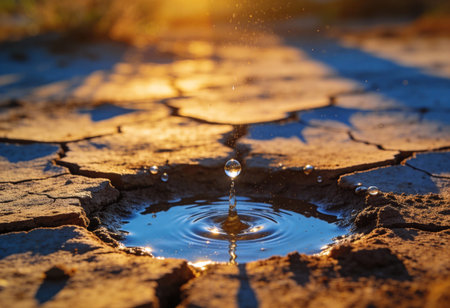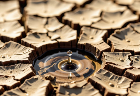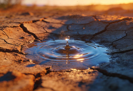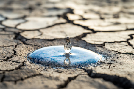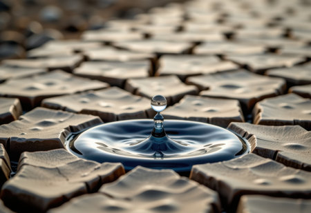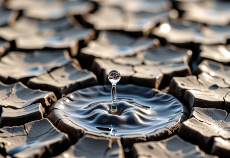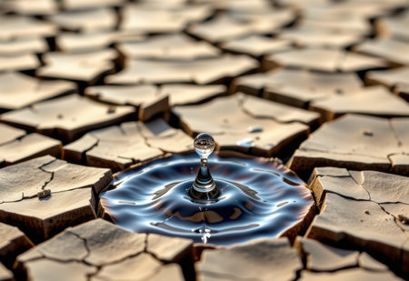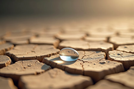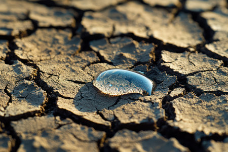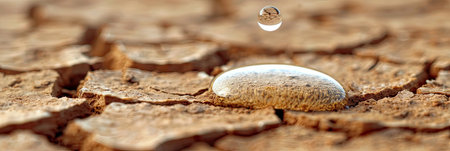 A lone droplet of water sits on a broken piece of arid land, creating a contrast in textures and highlighting the scarcity of moisture in the surroundings