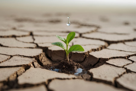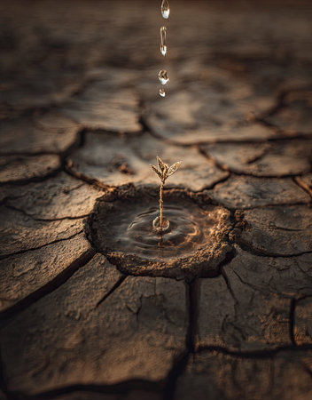A close-up captures water droplets falling onto a tiny plant emerging from cracked, dry earth. The image presents a contrasting interplay of textures, with the smooth water against the rough, fissured ground. The lighting appears soft, hinting at a natural outdoor setting, and could be utilized for various commercial and editorial purposes.