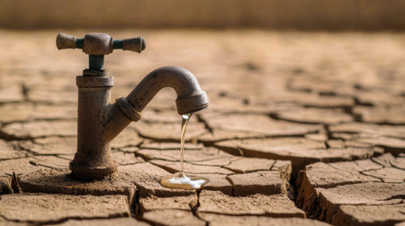 A faucet leaks water onto a dry, cracked earth, symbolizing the urgent issue of water scarcity and environmental challenges in a parched landscape.