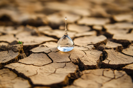 A solitary droplet rests on parched, cracked soil, highlighting themes of drought, climate change, and the value of water.